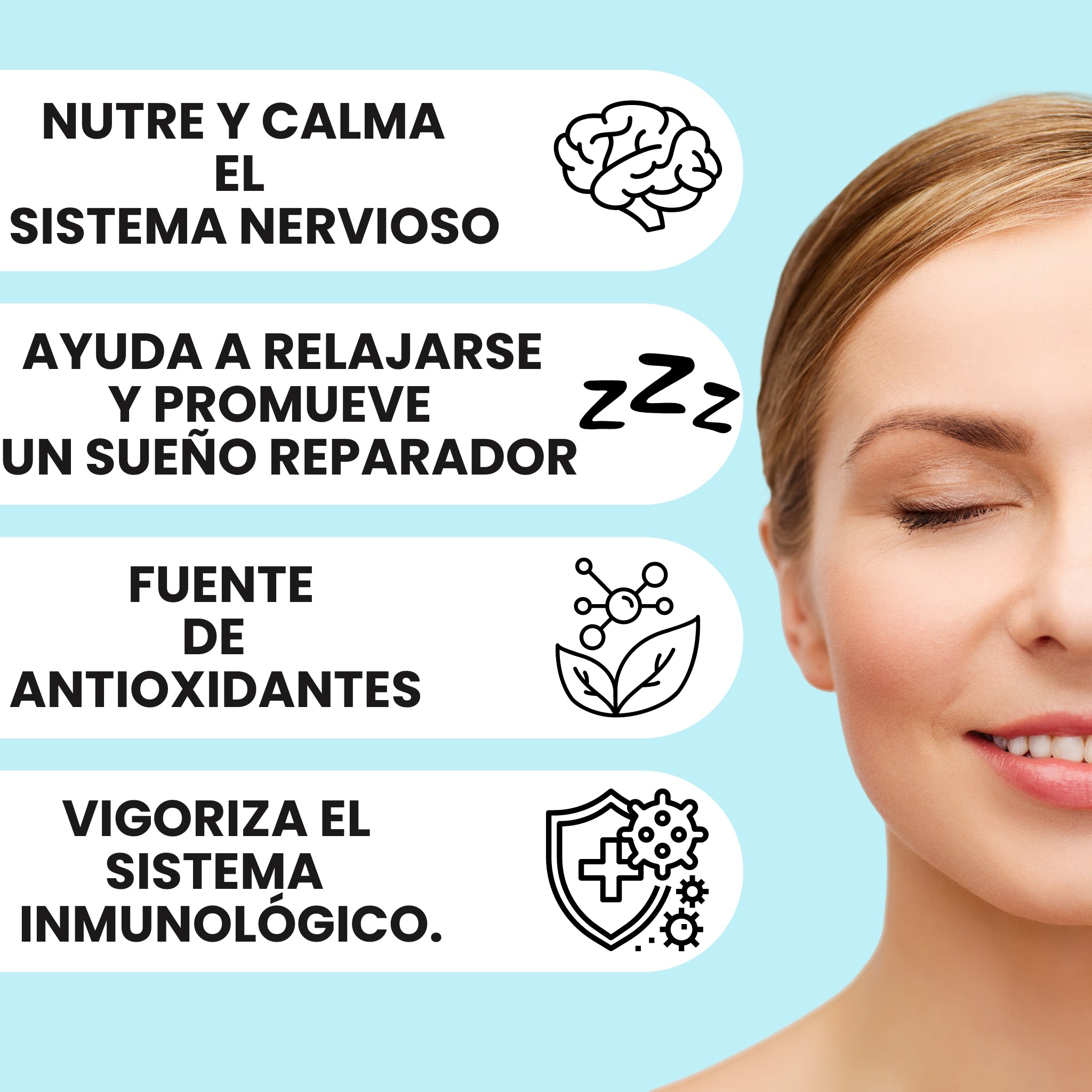 - Nutre y calma el sistema nervioso, proporcionando alivio del estrés y la ansiedad.
