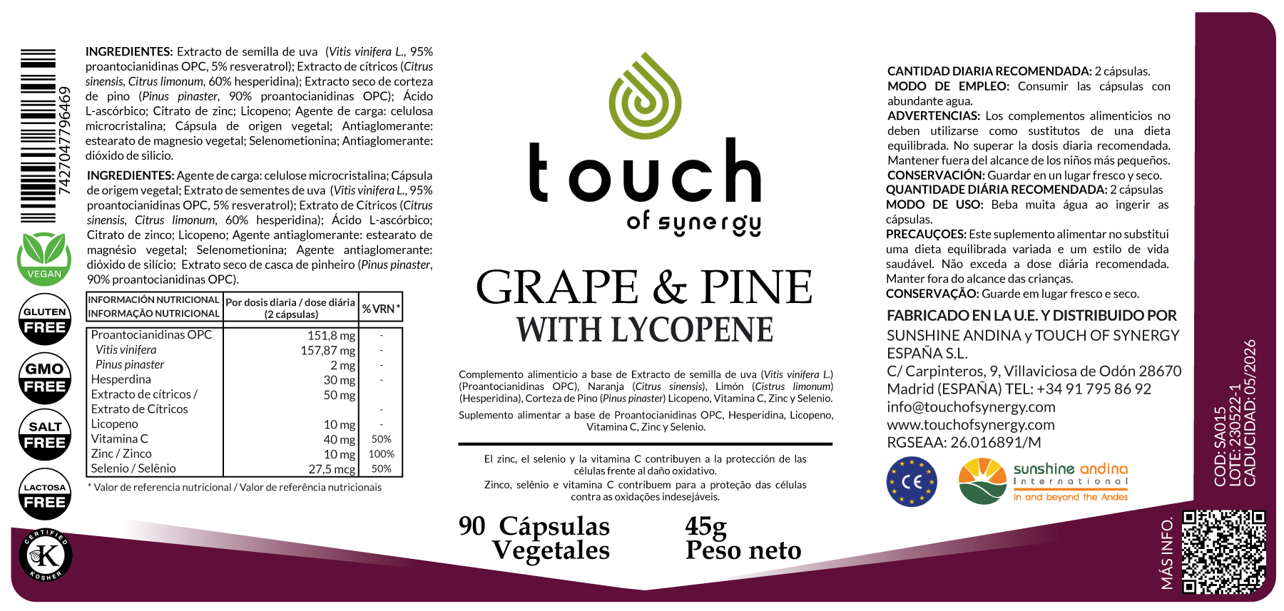 GRAPE & PINE WITH LYCOPENE es tu aliado en la lucha contra los radicales libres, apoyando tu salud desde el corazón hasta la piel, con una combinación única de extractos naturales y licopeno para una protección integral y duradera.