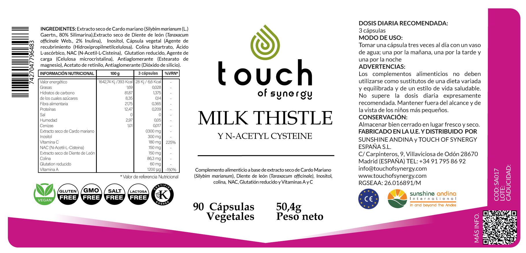 Elegir nuestro producto significa optar por una fórmula cuidadosamente desarrollada para ofrecer una protección integral al hígado y los riñones. Nuestra combinación única de extracto de semilla de cardo lechero (Silimarina), N-Acetilcisteína (NAC) y extracto seco de Diente de León no solo apoya la salud hepática y renal, sino que también potencia los sistemas antioxidantes naturales del cuerpo, manteniendo el equilibrio en los niveles de azúcar en sangre y promoviendo la salud de la piel y los ojos. Además, es un producto libre de gluten y alérgenos, apto para personas con dietas especiales.