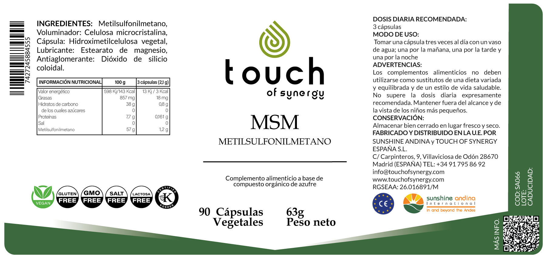 Cada cápsula contiene Metilsulfonilmetano (MSM), un compuesto natural presente en alimentos ricos en azufre. Este suplemento está formulado para ofrecer una dosis efectiva para el alivio de la inflamación y el dolor.