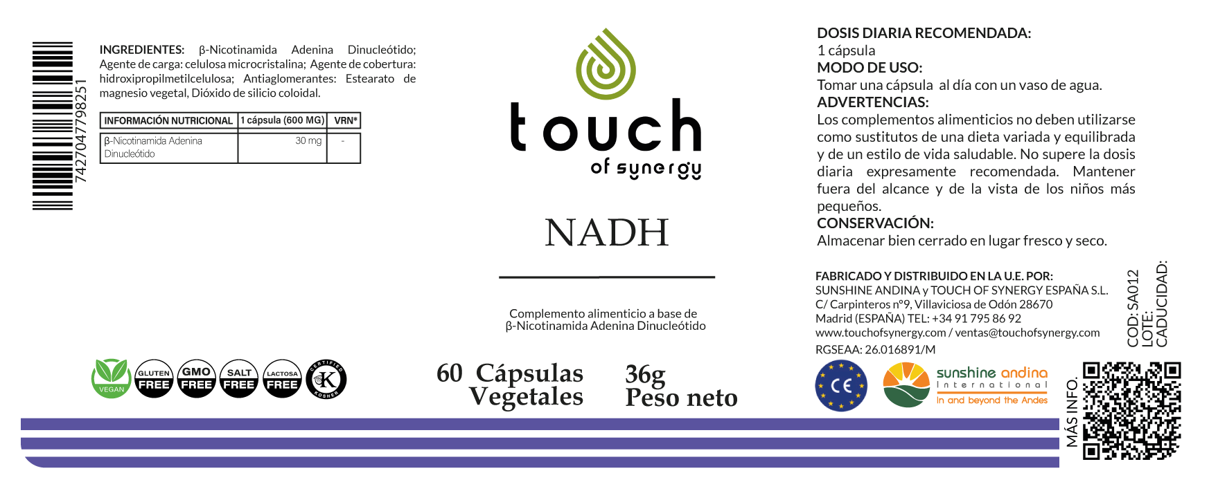 - Cada cápsula contiene 30 mg de NADH (Nicotinamida Adenina Dinucleótido Hidruro), una coenzima esencial en el metabolismo energético.