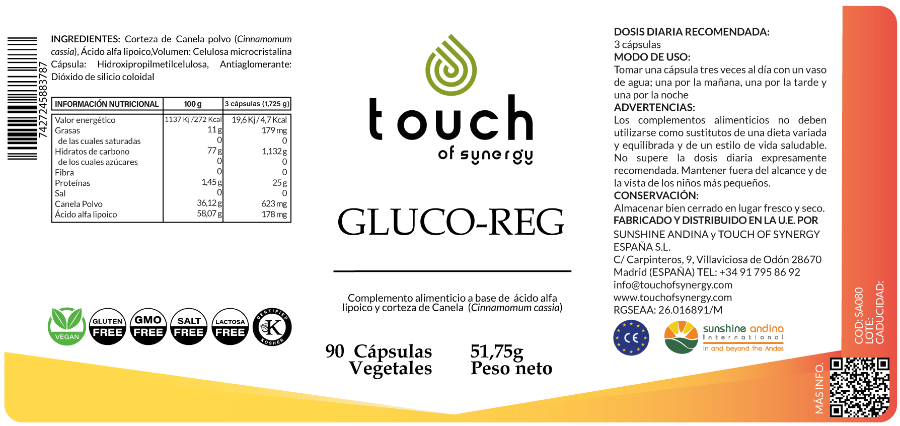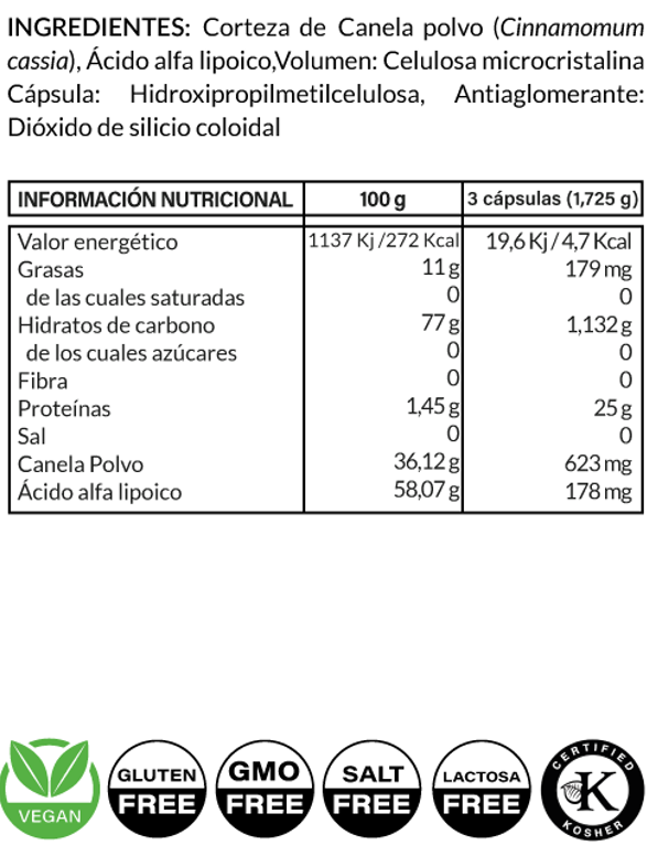 - Contiene Ácido Alfa Lipoico y Extracto seco de Canela.