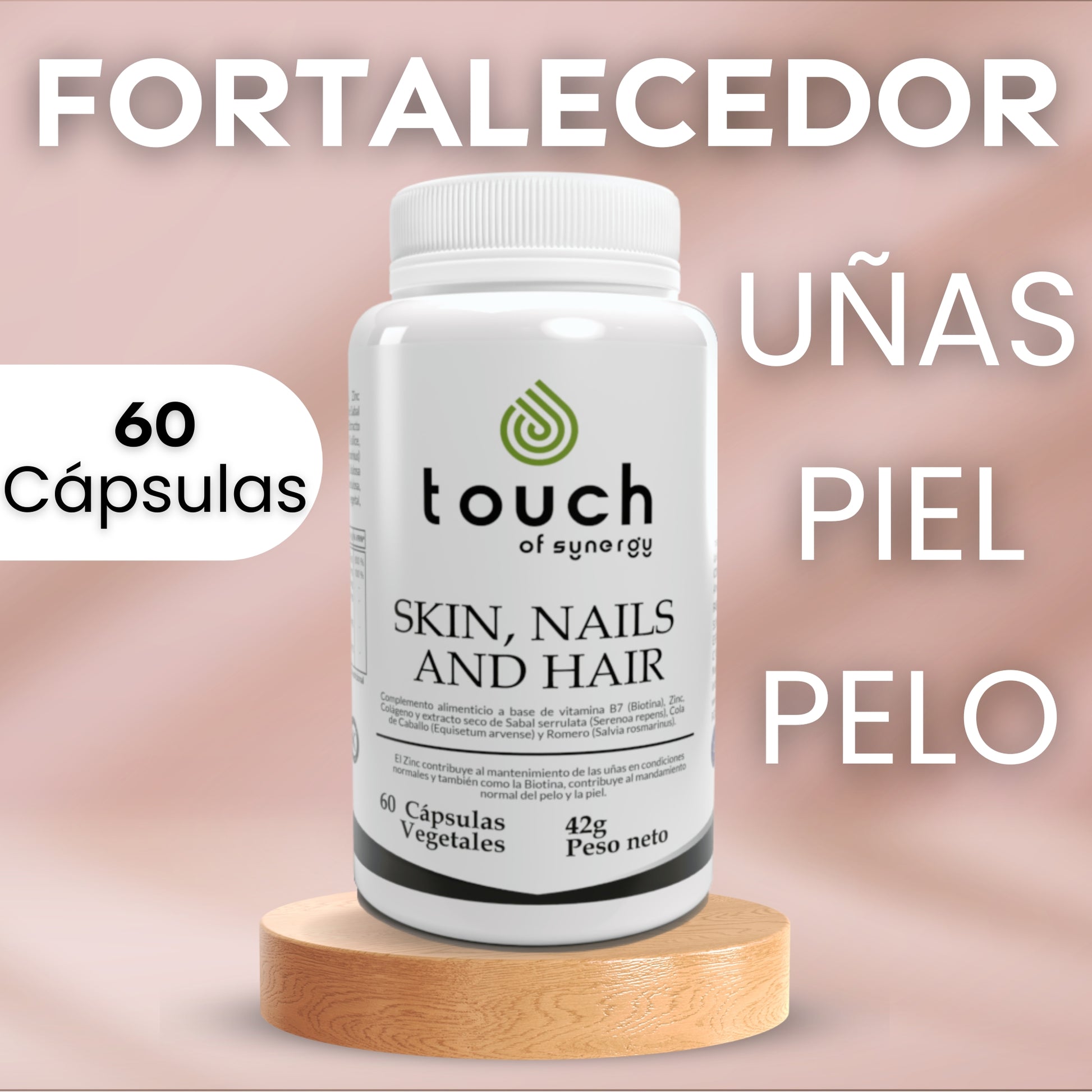 - Contiene una combinación de biotina, extracto de Cola de Caballo, extracto de Romero, Colágeno bovino Hidrolizado, Bisglicinato de Zinc y Saw Palmetto (Serenoa repens).