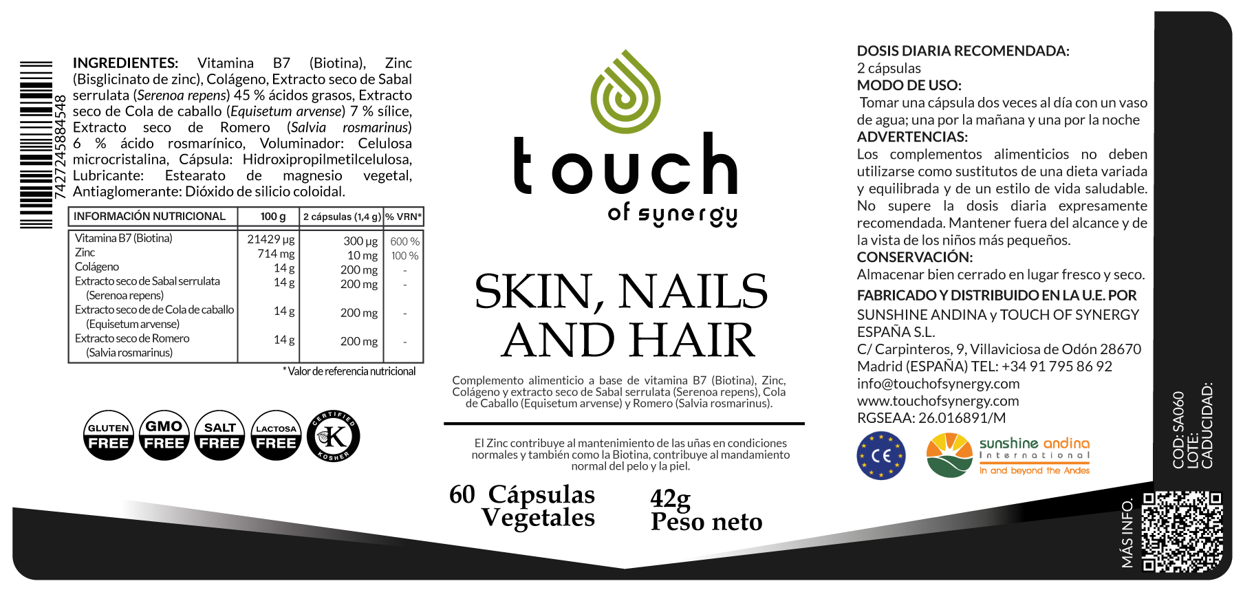 - Resultados Comprobados: Respaldado por ingredientes cuidadosamente seleccionados y una formulación precisa, SKIN, NAILS AND HAIR ha demostrado fortalecer las uñas, prevenir la caída del cabello, mejorar la firmeza y elasticidad de la piel, y promover un aspecto juvenil y radiante.