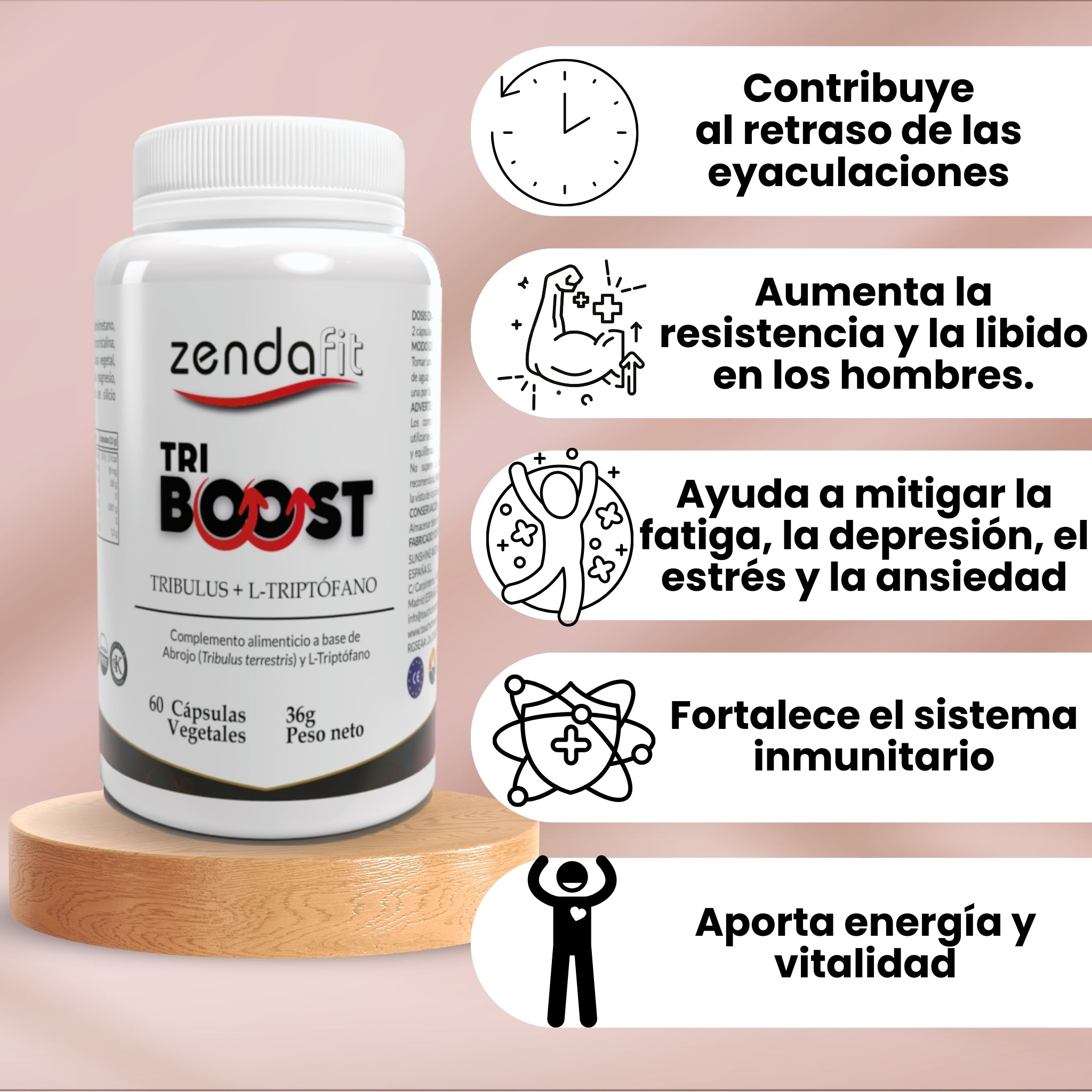 Nuestro producto, TriBoost, ofrece una combinación única de ingredientes naturales respaldados por la ciencia para abordar de manera efectiva problemas sexuales como la eyaculación precoz y la disminución del deseo sexual. Diseñado con extracto seco de Tribulus y L-Triptofano, TriBoost no solo ayuda a mejorar el rendimiento sexual y aumentar la libido, sino que también mitiga la fatiga, la ansiedad y el estrés, promoviendo así un bienestar general. Además, nuestra fórmula avanzada garantiza una alta calidad y eficacia, respaldada por porcentajes específicos de ingredientes activos para ofrecer resultados tangibles y duraderos.