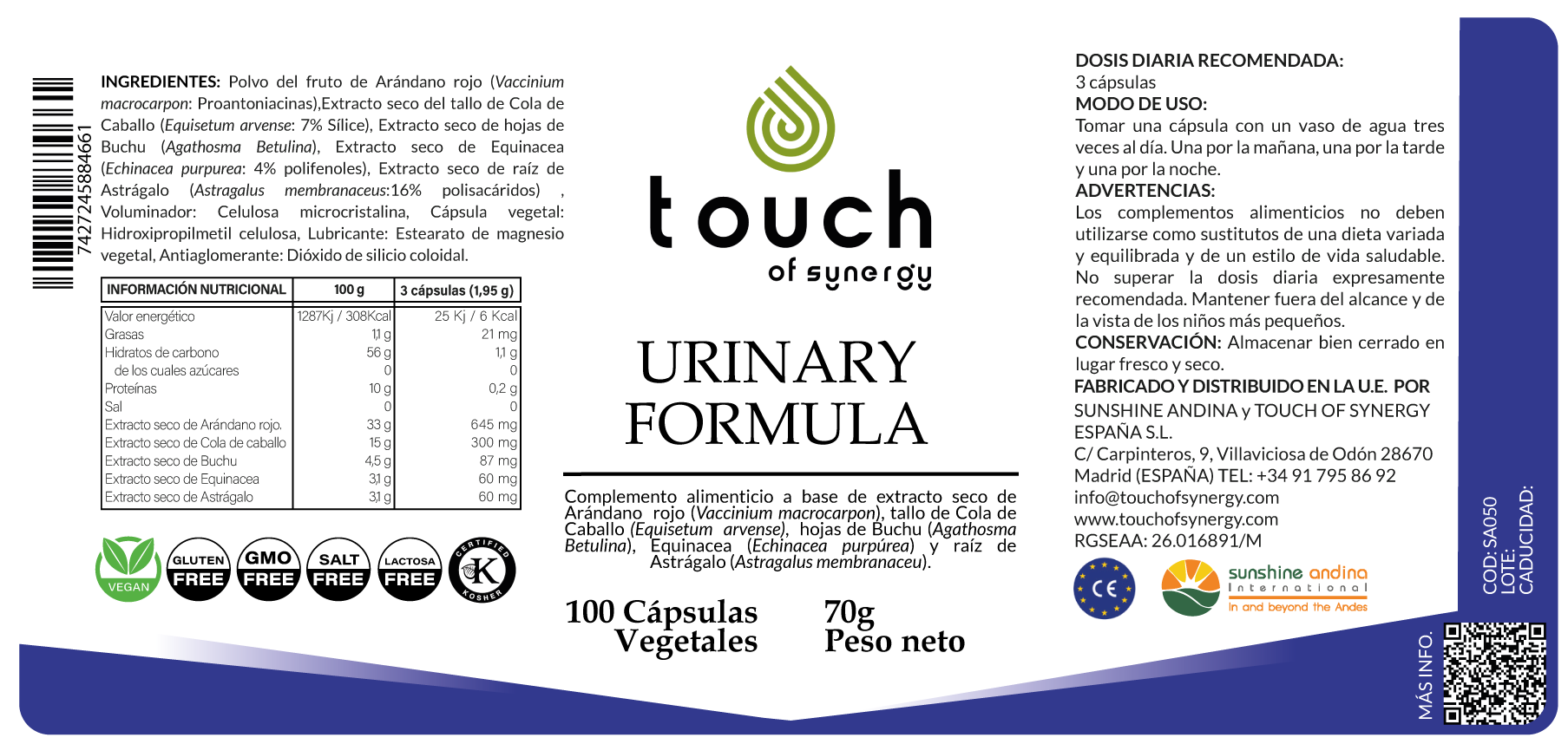 La dosis recomendada de Urinary Formula es de 3 cápsulas diarias tomadas con abundante agua. Para obtener los mejores resultados, se recomienda tomar las cápsulas en diferentes momentos del día, preferiblemente junto con las comidas principales. Esto permite una absorción óptima de los ingredientes y un apoyo constante a lo largo del día para mantener las vías urinarias saludables y reforzar el sistema inmunológico.