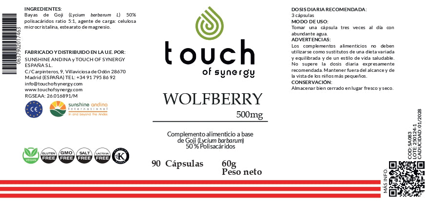 - Composición: Cada cápsula contiene 500 mg de extracto de bayas de Goji (Lycium barbarum l.).